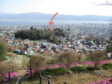 矢印のところが、さっきの霞ヶ城跡。諏訪神社もそこ。