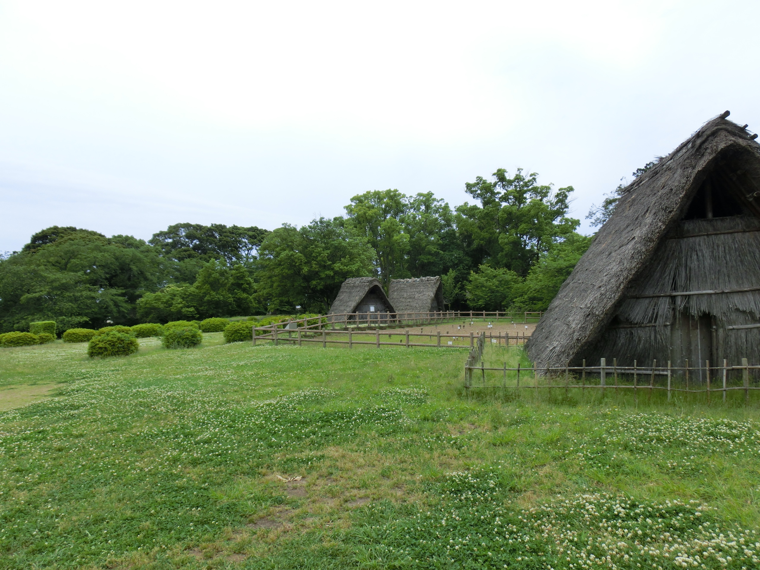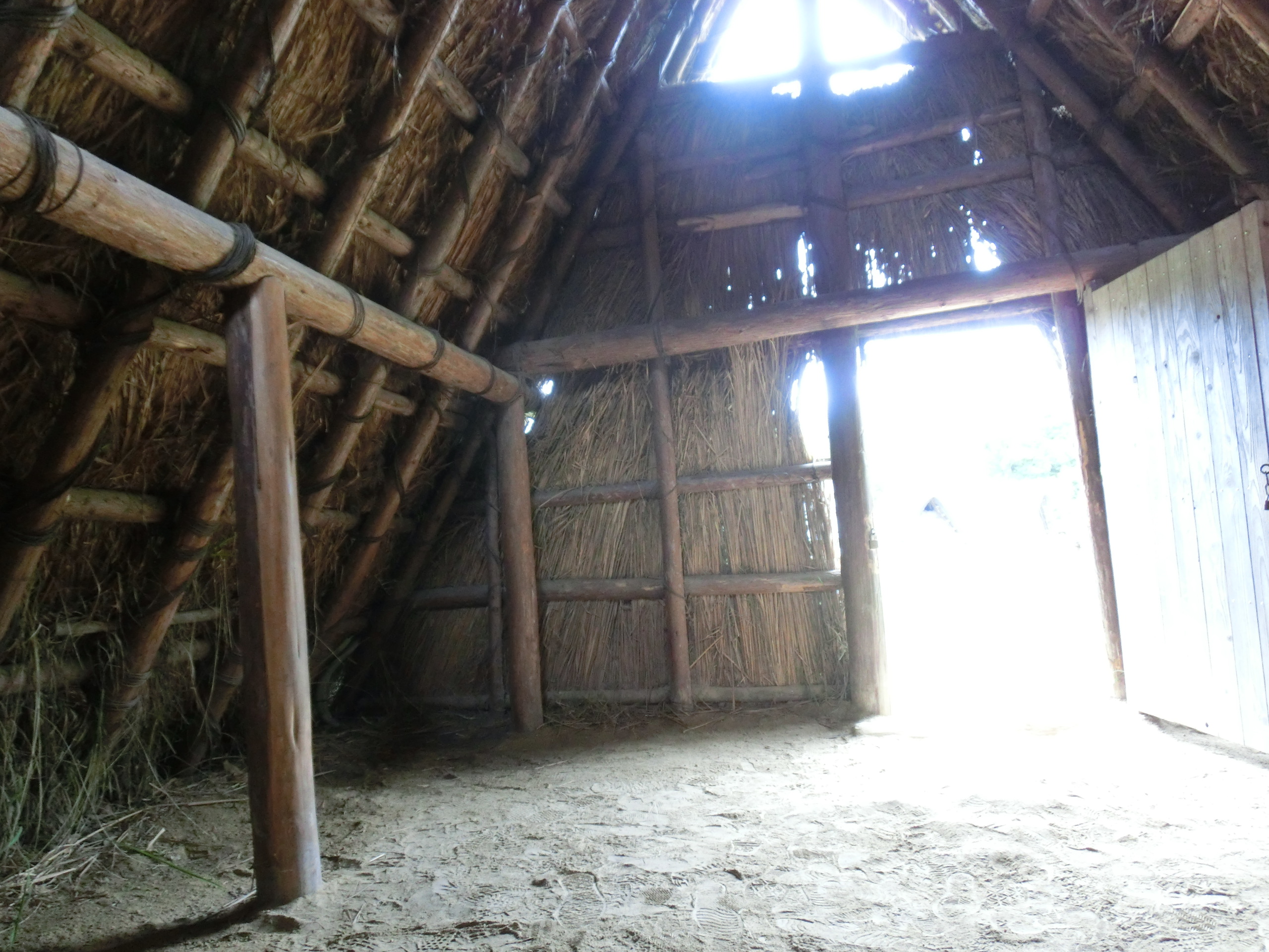 蜆塚遺跡(縄文時代約3000-4000年前)があったので、住居跡(復元)に入ったりして遊んでみた。