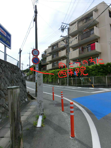 行く途中の道路に西来院の石碑。昔はここまで参道?だったのかな。